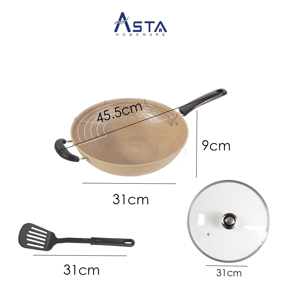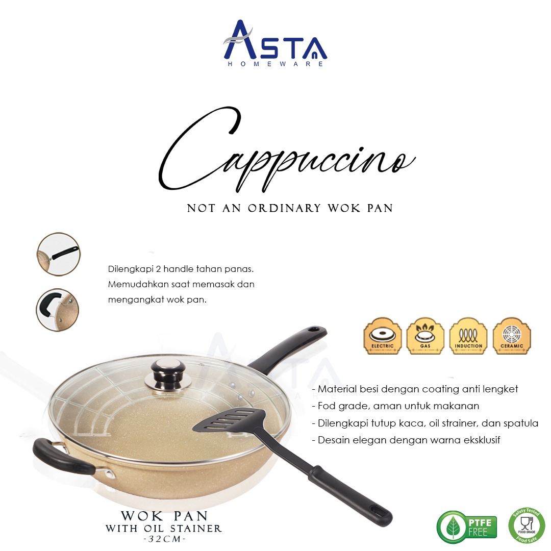 Coba cek wok pan panci set Cappuccino dari Asta Homeware ini. Warnanya eksklusif dan dilengkapi dengan tatakan saringan minyak dan spatula nylon. Tebal dan berkualitas. Tentunya juga food grade.