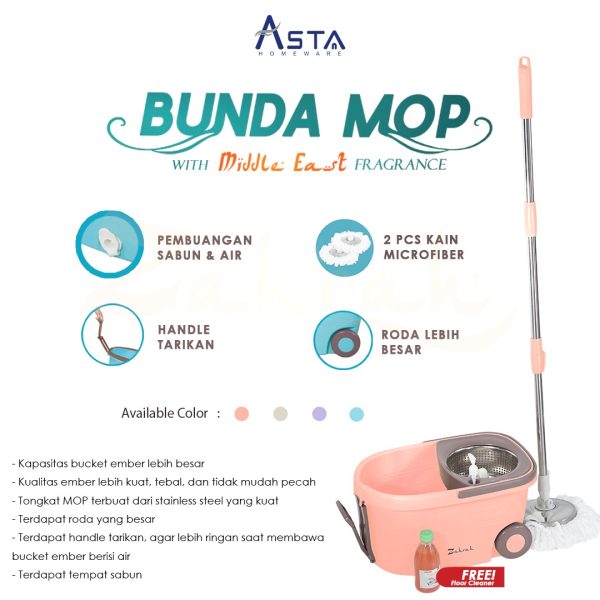 Alat pel lantai Bunda Mop dapat berputar 360° ( spin mop ), sehingga memudahkan kita dalam membersihkan setiap sudut lantai dengan mudah. Selain itu terdapat tuas pemutar yang membantu memutar kepala mop agar kain microfibrenya terbilas secara otomatis. Anda tidak perlu memutarnya manual seperti alat pel lantai tradisional. Praktis.